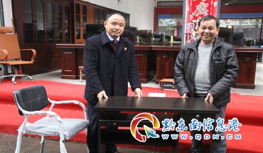 渡馬鎮龍盤村作為2017年天柱縣整體脫貧的行政村,其村委會辦公設施十分簡陋。12月17日,經縣地稅局聯系,楊仁君董事長代表天柱農商行親自將四套辦公桌椅交到龍盤村第一書記袁通仕手中。