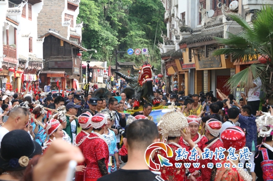 祭龍結束,舉行陸上游行。由四名壯漢抬著龍頭走在游行隊伍最前面,傳統的舞龍舞獅,民族舞蹈、花燈戲等民俗民間文藝表演隊緊隨其后,彩旗隊、花環隊、鼓號隊、古城太極隊等隊伍參加陸上游行。嗩吶、踩鼓舞、板凳舞等民間藝術也將盡展風姿,別是一番風味,人山人海,非常熱鬧,讓大家一飽眼福,與往年陸上游行有所不同的是,今年龍燈隊的編扎更加精益求精,增加民族隊、扎故事隊、儺戲、花燈歌舞、侗族情歌等突出展示了非遺遺產文化、傳統文化和鎮遠縣悠久的歷史文化特色。