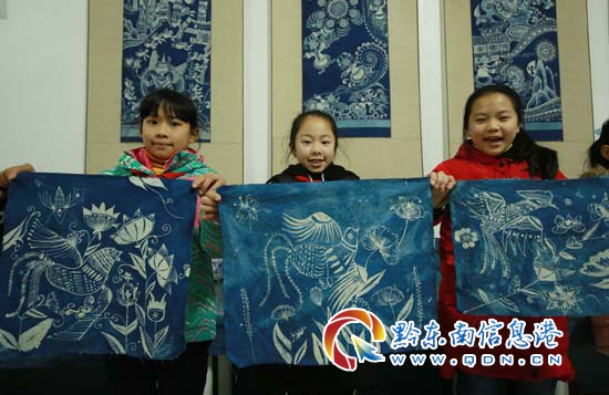 1月3日,在丹寨縣城關(guān)第一小學(xué)少年宮,蠟染興趣班的學(xué)生展示自己的蠟染作品