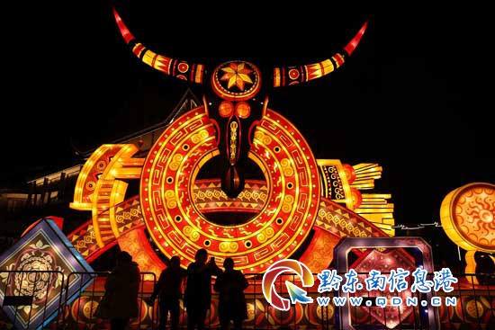 2月27日晚,在丹寨縣萬達小鎮景區,游客在觀賞彩燈。
