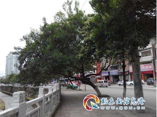 這棵樹曾經(jīng)像一個醉漢傾斜橫跨在行人道上,枝繁葉茂,樹枝還向河里伸探,長勢漂亮。2015年6月2日有媒體曾報道《凱里監(jiān)獄路口有棵“歪樹” 見證2008雪凝災(zāi)害》。