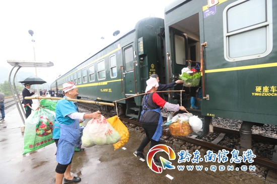 2018年5月10日,在加勞火車站,老百姓挑著蔬菜乘坐“慢火車”到凱里市去銷售。