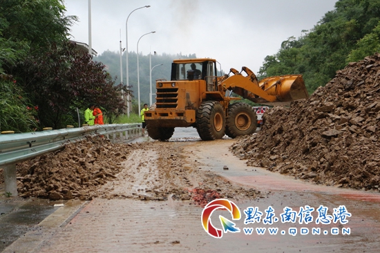22日凌晨5時(shí)左右,三黎高速錦屏往天柱方向高釀隧道出口處,水毀泥石流大面積沖下高速公路,造成交通中斷,貴州高速集團(tuán)凱里營(yíng)運(yùn)管理中心轄區(qū)橋隧站、應(yīng)急保暢中隊(duì)發(fā)現(xiàn)險(xiǎn)情后,迅速組織人員趕赴現(xiàn)場(chǎng)實(shí)施搶險(xiǎn),并及時(shí)對(duì)水毀點(diǎn)路段進(jìn)行渠化,同時(shí)立即啟動(dòng)防汛應(yīng)急預(yù)案,迅速將水毀現(xiàn)場(chǎng)情況逐級(jí)上報(bào)。得知險(xiǎn)情發(fā)生后,凱里營(yíng)運(yùn)管理中心領(lǐng)導(dǎo)班子紛紛趕赴一線指導(dǎo)抗洪搶險(xiǎn)工作。