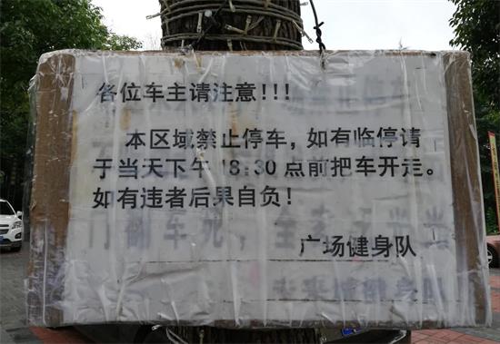 8月24 日上午,記者來到了網友所說的未來城售樓部的廣場,只見這個廣場不大,停著很多輛車,記者看到這個小廣場的樹上掛著7塊署名為“廣場健身隊”的禁止停車警示牌,其中的3塊警示牌有兩層,里面那層警示牌上的文字依然清晰可見,另外4塊警示牌只有一層,看著還比較新。