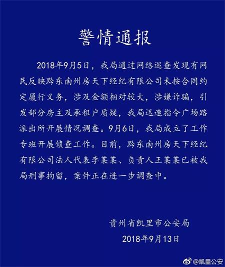 凱里公安 警情通報 :黔東南州房天下經(jīng)紀有限公司涉嫌合同詐騙