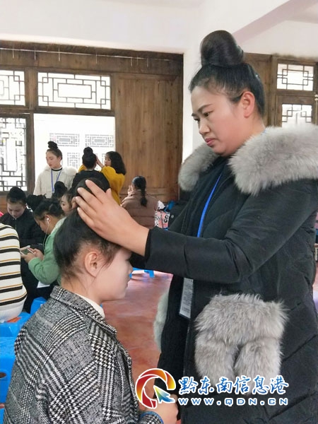 本網訊 距離2018年央視春晚現場直播沒有幾天時間,2018年2月9日下午,記者在2018年央視春晚黔東南黎平肇興分會場尚重代表團里拍攝侗族盛裝時偶遇來自該鎮上洋村的女支書石曉珍,見到她時,她正忙碌地給其他演員化妝、盤頭發。