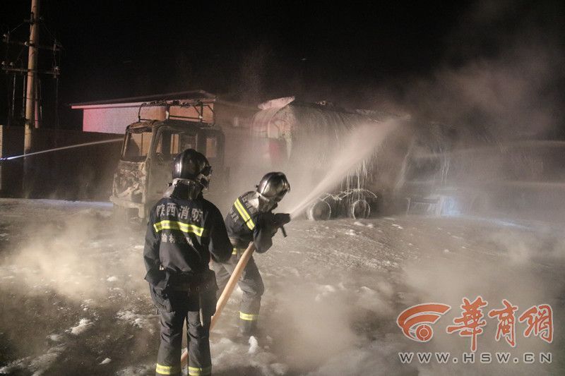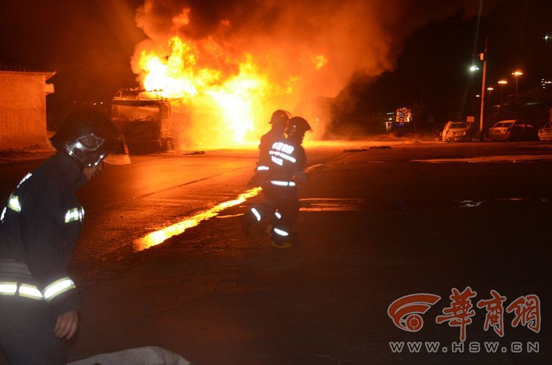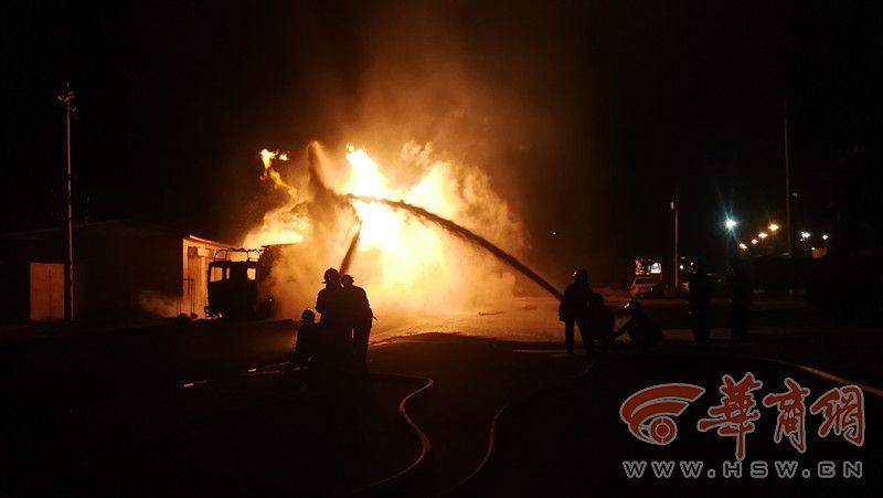 榆林119指揮中心接到報警后,調(diào)派16輛車100名消防隊員趕往現(xiàn)場。晚8時39分,消防員到達現(xiàn)場,油罐車泄漏著火,罐內(nèi)載有29噸凝析油,罐車西側(cè)五輛小轎車、三輛大車,已全部被引燃。著火點北側(cè)為居民樓。消防人員隨后對現(xiàn)場進行警戒,疏散周邊居民,對起火的五輛小車與三輛大車進行撲救。