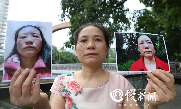 48歲的任女士看起來比實際年齡年輕,約莫40歲出頭。在她的左臉,隱約可見一些凹陷疤痕。她說這就是今年3月在璧山城區的柔婷美容院進行臉部微雕美容后導致過敏留下的。現在天氣一熱就陣陣發癢,因怕指甲刮破皮膚,只能用手掌搓一搓止癢。為佐證自己的說法,她向我們出示了當時拍攝的照片,臉部多處位置紅腫,只能用面目全非來形容。
