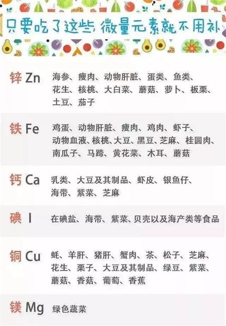 最后,再次提醒各位家長,拒絕做微量元素檢查,讓孩子少扎針,給自己和家人都省心省力。如果擔心孩子飲食不均衡,可按照下圖通過食物補充微量元素。