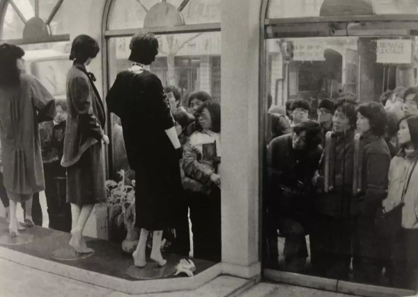 1987年2月20日清晨,在上海北京西路石門路上的蒙麗莎時裝公司櫥窗前,一群顧客正等待公司開門營業(yè)。 謝偉民 視覺中國
