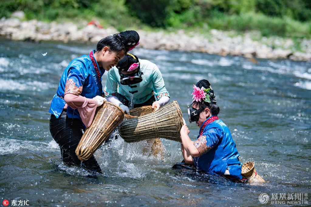 2018年6月17日,貴州省黔東南苗族侗族自治州臺(tái)江縣南宮鎮(zhèn)南宮村的村民集體下河“倒魚(yú)”過(guò)端午。