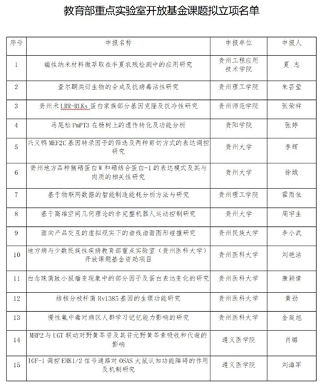 根據《貴州省教育廳辦公室關于組織教育部重點實驗室聯合開放基金項目申報通知》(黔教辦科研〔2018〕89號),教育廳共收到貴州大學等8所普通本科高校推薦申報7個教育部重點實驗室開放基金課題共計26項。