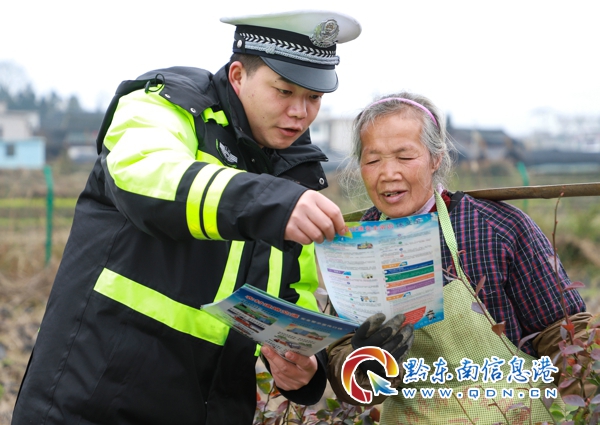 本網訊 早春時節,各地農民開始積極投入到農事勞動中,田間地頭到處是一派繁忙景象,2月22日,貴州省黔東南苗族侗族自治州丹寨縣交警大隊組織宣傳民警深入轄區藍莓種植基地,向正在勞作的群眾開展交通安全宣傳。(陸德華)