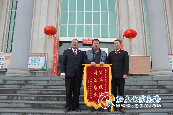 本網(wǎng)訊 3月11日上午,申請(qǐng)執(zhí)行楊某平把繡有“公正執(zhí)法,司法為民”的八字錦旗敬獻(xiàn)給錦屏縣人民法院執(zhí)行局,表達(dá)他自己對(duì)執(zhí)行法官的感激之情。