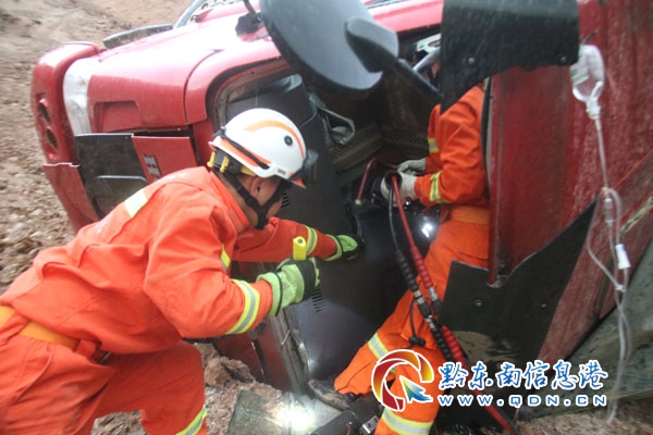 本網訊 4月24日16時12分,凱里市開發區大隊接到報警稱:凱里經濟開發區農博會建筑工地,一輛大貨車不慎滑下坡底,有人員被困,情況緊急。接到報警后,開發區大隊立即出動一個搶險救援編隊前往處置。