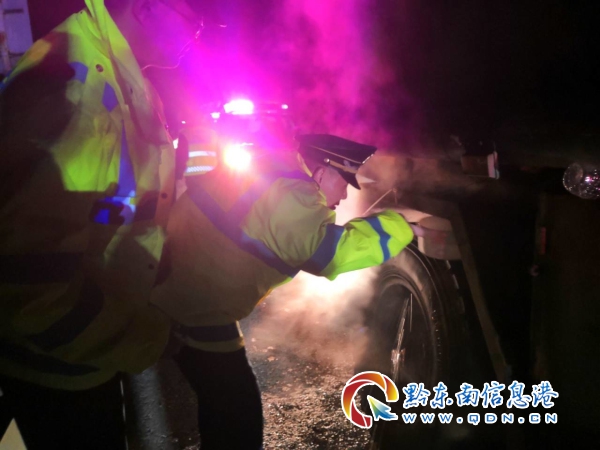 該車是從凱里西收費站進入高速公路,16時40分行駛至該地點時因車輛軸承斷裂不能行駛,停靠于此并報警等待救援。17時20分在救援的過程中因該車輛的后右輪軸承斷裂在拖車的過程中冒出大量濃煙,情況十分危急,現場路政員迅速從執法車輛里拿出滅火器、礦泉水對車輛輪胎進行降溫,降溫后行駛不到150米左右依然會冒出濃煙,滅火器和車上的礦泉水已經用完了,如再繼續行駛車輛極有可能起火,后果不堪設想,為了能及時的排出險情,17時30分經路政人員與現場交警、應急部門現場商議決定,采取邊走邊對車輛輪胎進行降溫的方式,將車輛拖出凱里東收費站。21時20分,在各部門的共同努力下,經過近四個小時的施救,故障車輛安全拖離,險情終于解除。