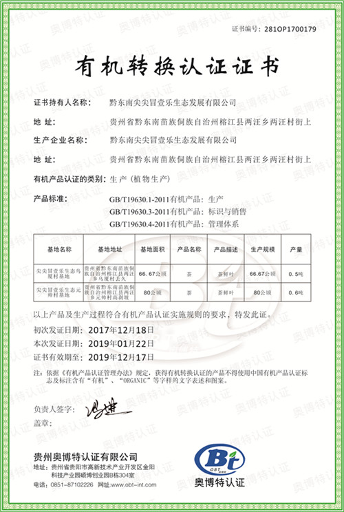 公司堅持走有機路線,從茶葉的良種培育,有機化栽培,標準化生產和管理等各個環節嚴格要求。依托傳統茶樹病蟲害有機防治技術以及無公害肥料—油枯,在茶葉的生長、加工過程中不施用任何人工合成的化肥農藥、植物生長調節劑、化學食品添加劑,保證茶葉生長環境完全符合有機茶的標準,并通過了貴州奧博認證有限公司2017年至2019年的有機轉換認證。