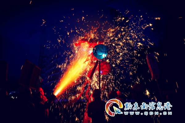 2月19日傍晚,臺江縣城鑼鼓喧天、熱鬧至極。每家每戶早早吃過晚飯,待百龍齊聚臺江縣城后一齊狂歡共度元宵之夜。夜幕降臨,來自各街道各村寨的龍云集縣城,在街上狂舞接受噓花瘋狂的“洗禮”。全城百姓不論男女老幼全家出動,或觀看舞龍噓花或參與噓花隊伍之中,噓花者用自制或買來的噓花筒對著龍噓花,舞龍者赤身光臂迎著火花舞龍狂奔,觀者則緊跟著舞龍噓花隊伍,一邊歡呼著一邊用鏡頭記錄這狂歡的精彩時刻。