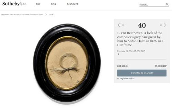 蘇富比拍賣行官網顯示,當地時間11日,貝多芬的一縷頭發在倫敦拍出了3.5萬英鎊(約合30余萬元人民幣)。