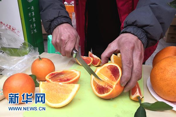 在開州區第二屆“消費扶貧直通車、網上網下愛心購”活動展銷現場,彭世國向市民推介血橙。新華網 葛琦 攝