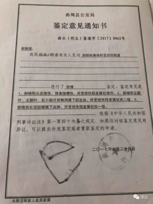 郝曉剛的父親郝振國在2017年6月29日收到一份鑒定意見通知書,其內容顯示,郝曉剛的傷情鑒定為:頭皮挫傷、體表擦傷,所受損傷程度為輕微傷。其左額葉、左顳葉、右小腦片狀蛛網膜下腔出血,所屬損傷程度為輕傷二級。右頂部硬膜下血腫,所受損傷程度屬輕傷一級。