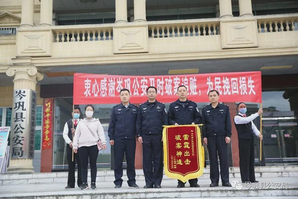 從辦案民警那里領回全部被盜財物后,田某蘭十分高興。為表示感謝,她特意制作了一面錦旗,請來了樂隊,帶著女兒一起,敲鑼打鼓送到岑鞏縣公安局,連聲稱贊岑鞏公安工作效率高 ! 為民服務態度好 ! 執法辦案本領強 !
