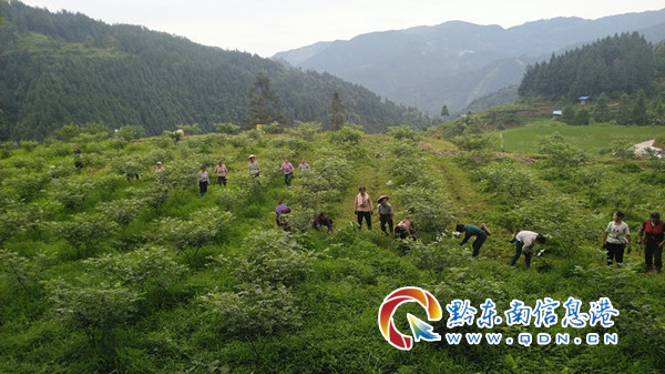 “高舟村種植吳茱萸200畝,去年部分掛果,今年株株花苞滿枝,為確保花開如許、花落碩果累累,合作社及時(shí)組織村民除草施肥,每日支付給大家80元工錢,守在家門口就能就業(yè)有錢掙,入股的吳茱萸也豐收在望,大家喜上眉梢,邊干邊唱,難掩內(nèi)心的喜悅。”高舟村主任羅邦京指著吳茱萸樹下躬身干活山歌作伴的群眾補(bǔ)充道。