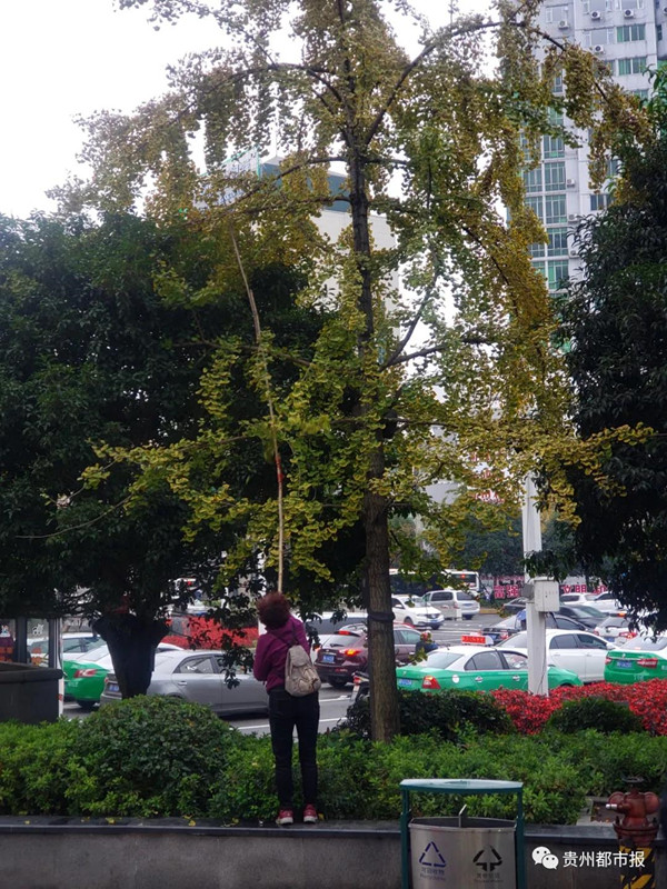 近日,在凱里大十字附近門店上班的張先生向記者反映稱,在凱里大十字綠化帶上的銀杏樹最近結果了,最近一周,每天都有人用竹竿甚至爬樹去摘果子,銀杏葉散落一地,樹下一片狼藉,張先生覺得這樣的行為實在不妥,也不安全。