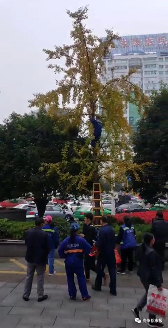 據了解,因擔心還會有市民再去爬樹摘果,10月30日下午3時左右,凱里市園林管理處園林工人已到現場對銀杏果進行清理。
