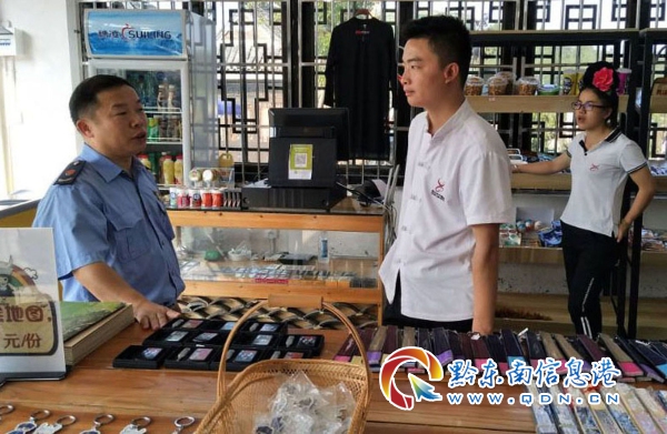 圖為執(zhí)法人員指導(dǎo)經(jīng)營(yíng)旅游商品場(chǎng)面