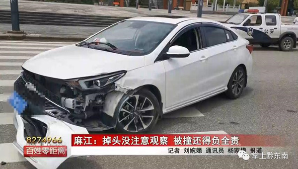 隨后民警調取了事發路段的監控視頻,從視頻上來看,白色小轎車當時是由麻江縣城沿長興大道往官井方向行駛,行駛至該路段時,突然從最右側車道掉頭往縣城方向行駛,掉頭時沒有發現直行方向的小型貨車,結果小型貨車撞在白色小車的左前角上,白色小轎車保險杠脫落,事故發生時雙方駕駛的速度也不算快。通過現場勘查,民警做出判定,事故是由于白色小轎車掉頭影響直行的小貨車造成的。
