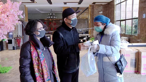 記者今天來到凱里市水秀云溪酒店,這里目前入住了93名湖北籍旅客,在現(xiàn)場,工作人員正在給前來安頓的湖北武漢游客黃建夫婦發(fā)放血壓和血糖測量儀,便于他們在酒店隨時(shí)觀察自己的血壓、血糖。而進(jìn)入酒店的每一位游客,入駐酒店時(shí)都需要進(jìn)行嚴(yán)格地檢測和登記。此外,酒店還制定好了餐食,做好個(gè)性化需求。