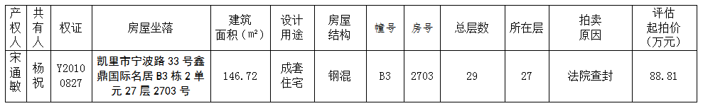 四、凱里市寧波路33號鑫鼎國際名居B3棟2單元27層2703號房屋處置明細表: