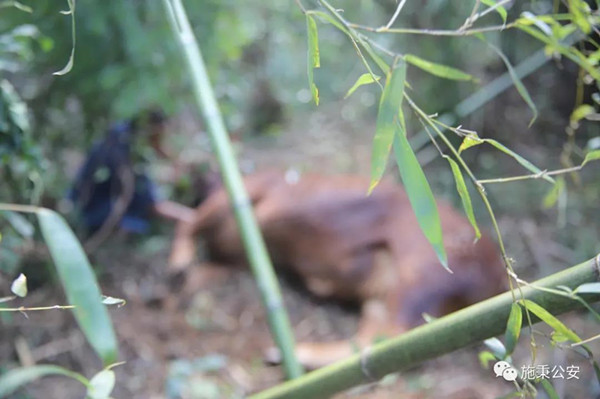接到該指令后,牛大場派出所民警立即驅車趕往現場,發現在牛大場村水井坡組背后的坡上有一頭黃牛在樹林中,脾氣暴躁,疑似受驚,人員無法靠近,威脅到周圍出行村民的人身安全,在場的牛主人李某德強烈要求公安機關給予幫助,將該牛控制,以免造成嚴重后果。了解情況后,牛大場派出所立即將該情況上報至縣公安局黨委,縣公安局領導高度重視,極力統籌安排協調,立刻派遣業務素質過硬的民警同志去處理,佩戴好裝備后,民警立即趕赴現場,將黃牛擊斃。