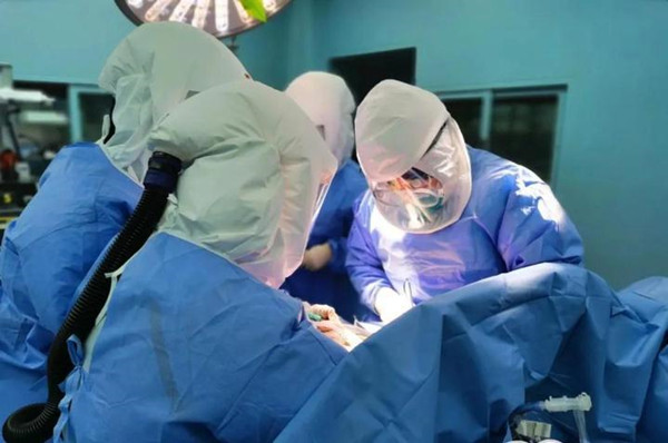 做好全套防護措施,戴上正壓頭套,由肺移植科主任韓威力主刀,ECMO下的肺移植手術正式開始。