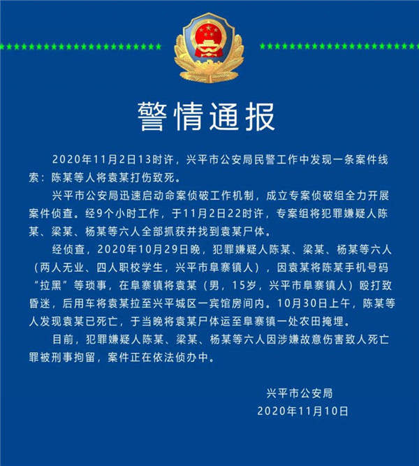 11 月 10 日下午,據(jù)陜西興平公安通報,11 月 2 日 13 時許,興平市公安局民警工作中發(fā)現(xiàn)一條案件線索:陳某等人將袁某打傷致死。11 月 2 日 22 時許,警方將犯罪嫌疑人陳某、梁某、楊某等六人全部抓獲并找到袁某尸體。