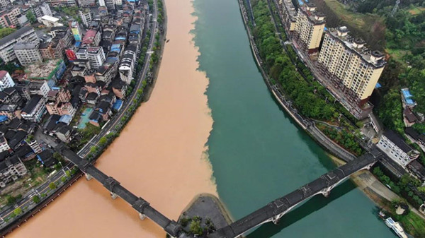 4月15日,受強降雨影響,位于錦屏縣三江鎮的清水江和小江交匯處一清一濁,呈現出“涇渭分明”的景觀。