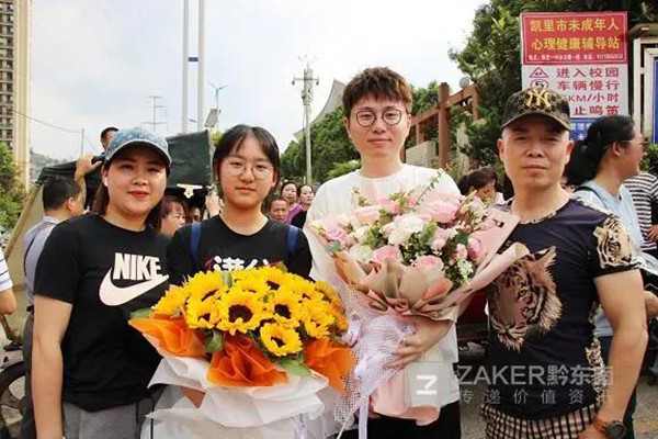 開考第一天,一張照片在凱里人的朋友圈和抖音里熱傳了起來,圖中,一名媽媽手舉偶像牌子在凱里市第一中學考點外接孩子。" 考試結束后,記者在現場見到了照片中的主人公。
