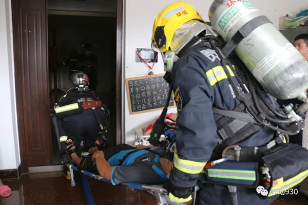 當天上午9點40分,演練正式開始!演練設計為:狀元府8樓一戶人家發生火災,火勢迅速向四周蔓延,有人員被困,情況十分危急。洗馬河街道社區工作人員發現火情立即向119報警,并聯合小區物管展開自救,組織人員疏散,社區微型消防站救援力量進行先期火災處置。119指揮中心接到報警后,立即調集1個登高編隊(1輛51米登高平臺消防車)、1個滅火編隊(1輛水罐消防車、1輛高噴消防車)趕到現場,市消防大隊當日值班人員乘坐指揮車遂行出動,集中開展高層建筑火情偵察、現場組織指揮決策、啟用固定消防設施、延樓層鋪設水帶內攻滅火、被困人員搜索與營救、火場高層供水、戰勤保障等演練環節,經過近20分鐘全體參戰人員的奮力撲救,成功解救出被困人員,火災徹底撲滅,演練圓滿結束。