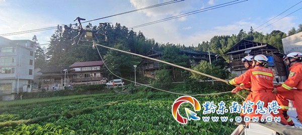 本網訊 8月18日16時23分,黎平大隊接到群眾報警稱:黎平縣中潮鎮三合村一架無人機掛到電線桿上,飛控手無法取下,求助消防隊,接到報警后,黎平縣消防救援大隊立即出動1車8名指戰員前往現場處置。