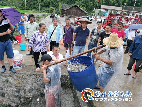 本網訊 近日,天柱縣高釀鎮高釀、上花、富榮、坪場等村村民提著水桶正忙著領魚苗,現場一派繁忙景象,歡聲笑語不斷。