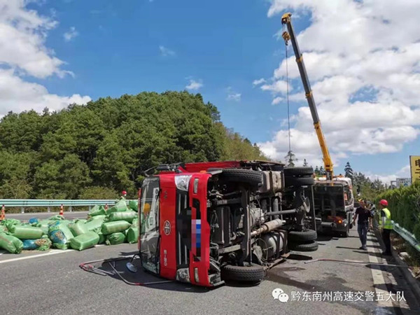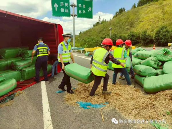 經(jīng)詢問調(diào)查得知,該貨車從廣西拉一貨車甘蔗渣往銅仁喂牛,在行經(jīng)天鎮(zhèn)高速屏樹互通路段時(shí),貨車與前方小車行駛在同一車道上,由于貨車司機(jī)跟車距離太近,前方小車減速后貨車司機(jī)一時(shí)心急向左超車道猛打方向盤,導(dǎo)致車輛因重心不穩(wěn)發(fā)生側(cè)翻,貨車上裝載的甘蔗渣散落一地,所幸并無人員傷亡。