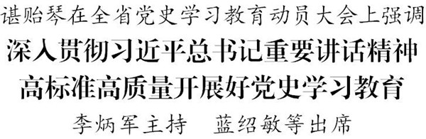 諶貽琴強調(diào),開展黨史學習教育,是黨的政治生活中的一件大事。要領(lǐng)導(dǎo)帶頭、壓實責任,把學習教育緊緊抓在手上,切實推動中央和省委部署要求落到實處。要統(tǒng)籌兼顧、抓好結(jié)合,把開展好黨史學習教育和“牢記殷切囑托、忠誠干凈擔當、喜迎建黨百年”專題教育結(jié)合起來開展好,同統(tǒng)籌疫情防控、鞏固拓展脫貧攻堅成果、推動高質(zhì)量發(fā)展結(jié)合起來。要把準導(dǎo)向、營造氛圍,樹立正確的黨史觀,旗幟鮮明反對歷史虛無主義,理直氣壯弘揚黨史的浩然正氣,大力宣傳黨的百年非凡奮斗歷程和我省經(jīng)濟社會發(fā)展進程中涌現(xiàn)出來的革命烈士、英雄人物和先進模范。要創(chuàng)新方法、務(wù)求實效,堅持因地制宜,加強分類指導(dǎo),推進內(nèi)容、形式、方法的創(chuàng)新,切實為群眾辦實事,增強人民群眾獲得感、幸福感、安全感。
