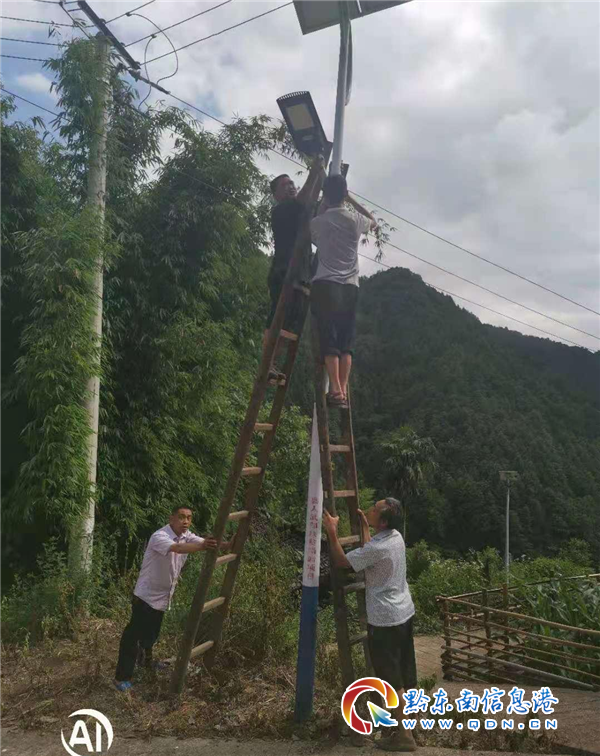 原來是江梭村的村支兩委、駐村干部、工作隊隊員、各組組長及相關專業(yè)人員正頂著烈日對損壞路燈進行檢修和更換,一些村民也主動上前幫忙。