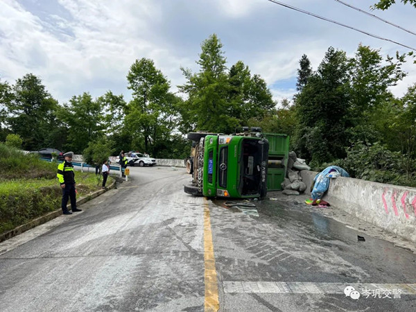 接警后,岑鞏縣公安局交警大隊四中隊值班民警立即趕往現場。到場后民警發現,一輛貨車側翻在彎道上,擋風玻璃完全破碎,車內物品甩出車外堆放在一旁,車內的機油流了一地,車上的水泥掉落在地上和防護墻外,幸虧防護墻擋住了貨車的沖擊,否則很有可能翻下山林,后果就難以預料了。