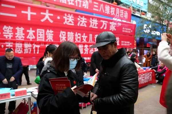 本次活動通過在現場懸掛宣傳橫幅、設立法律咨詢臺、派發法治宣傳資料等多種形式向廣大婦女群眾提供維權宣傳服務,為過往群眾發放《民法典》、《婦女權益保障法》、《反家庭暴力法》、防范電信詐騙等法律宣傳資料,深入宣傳反家庭暴力、保障婦女兒童權益等方面的法律法規和生活防范知識。同時,現場干警們用生動的案例對來往群眾進行講解,并對前來咨詢法律問題的群眾耐心解答,細致地向其講解相關法律規定及具體案件的訴訟程序,引導其積極維護自身合法權益,選擇合理的糾紛解決方式。