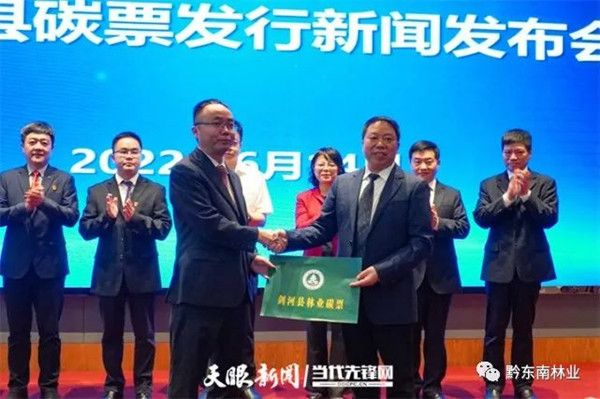 會上,劍河縣委領導為劍河縣林工商公司頒發了面額為1700萬元的黔東南州首張碳票;貴州銀行黔東南州分行向劍河新盛林投公司碳匯交易項目授信流動資金貸款1000萬元。