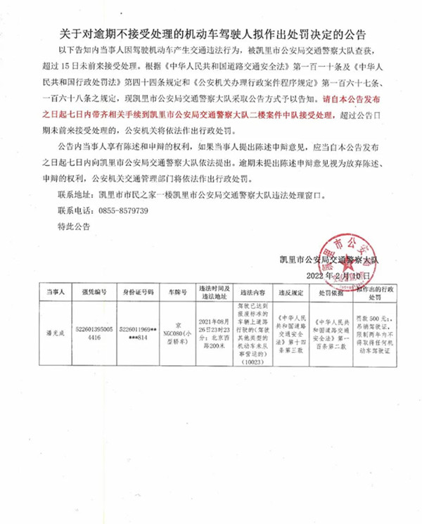 以下告知內(nèi)當(dāng)事人因駕駛機(jī)動(dòng)車產(chǎn)生交通違法行為,被凱里市公安局交通警察大隊(duì)查獲,超過15日未前來(lái)接受處理。根據(jù)《中華人民共和國(guó)道路交通安全法》第一百一十條及《中華人民共和國(guó)行政處罰法》第四十四條規(guī)定和《公安機(jī)關(guān)辦理行政案件程序規(guī)定》第一百六十七條、一百六十八條之規(guī)定,現(xiàn)凱里市公安局交通警察大隊(duì)采取公告方式予以告知。請(qǐng)自本公告發(fā)布之日起七日內(nèi)帶齊相關(guān)手續(xù)到凱里市公安局交通警察大隊(duì)二樓案件中隊(duì)接受處理,超過公告日期未前來(lái)接受處理的,公安機(jī)關(guān)將依法作出行政處罰。