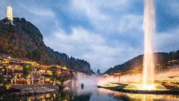 除了奇絕夜景,還有精彩表演將入夜后的氣氛推至高潮。夜幕降臨,悠揚的黔北民族音樂中,連綿梯田上跳躍著五彩燈光。音樂的節奏交響,簇簇水柱隨之舞動,如畫的水景,如夢如幻的光影,讓人念念不忘。