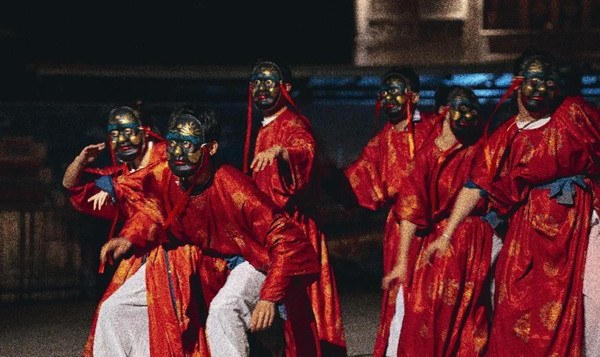 每晚的廻龍島廣場,還有精彩紛呈的儺面舞表演。儺面舞起源于儺戲,借以貴州方言演繹的儺戲選段傳達酬神還愿、祈福平安的美好祝愿。儺面舞作為一種混合型的古老藝術形式,具有鮮明的地域特色以及豐富的文化內涵。